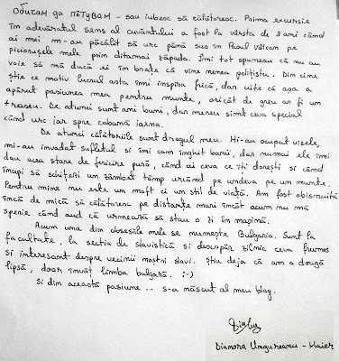 Dianora vorbeşte în mesajul ei despre cea mai mare pasiune a ei, călătoritul, despre cum a dobândit-o şi despre cum a devenit ea subiect de blog. Despre pasiunea pentru Bulgaria şi despre frumuseţea culturii slave.