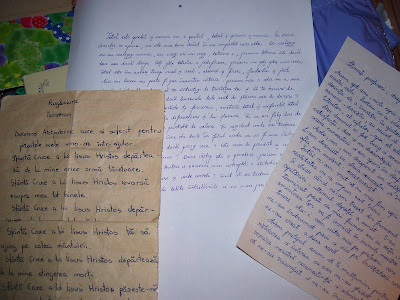 Did mi-a trimis 3 mostre de scris, dar şi o evoluţie totodată. 😛 A început cu o rugăciune de prin clasa a patra, a continuat cu o scrisoare către profesori din clasa a 8-a (seamănă foarte mult cu scrisul meu de pe atunci), şi a încheiat cu un citat din Cioran în clasa a 12-a (foaia din mijloc).