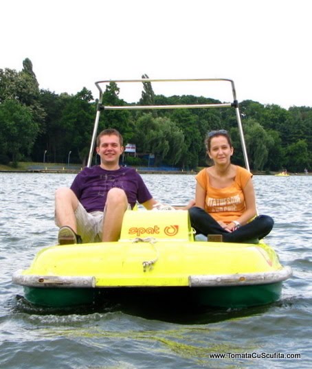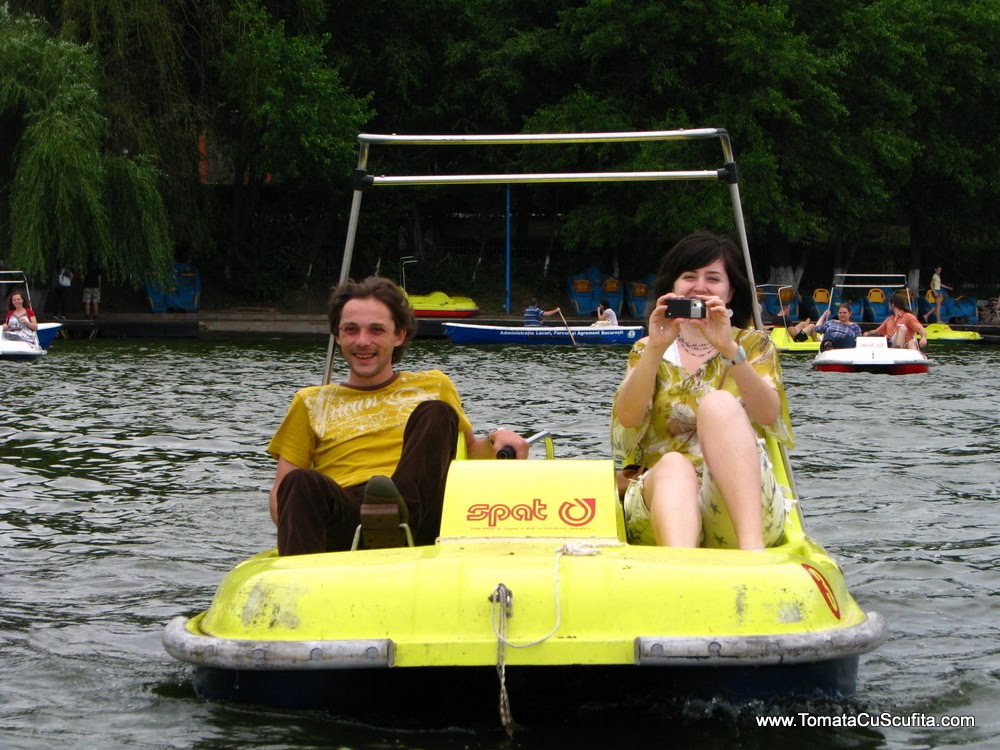 Bun, am cumpărat bilete, am făcut echipele şi am plecat la pedalat: Nebuloasa şi cu mine, Oana cu Ştefan, Minxieee cu DeMaio, Simona cu Silviu, Ela cu Alex şi undeva la întoarcere ne-am întâlnit pe lac cu Corina şi cu Sorin Grumăzescu, care deşi iniţial a refuzat şi a făcut-o pe Lili să meargă cu vaporaşul, totuşi s-a încumetat. Cu hidrobicicleta pe Herăstrău a fost foarte frumos. Cu atât mai frumos cu cât nu-mi aduc aminte dacă m-am mai plimbat vreodată cu una, deşi ştiu că la 3 ani m-am rătăcit pe mare cu tatăl meu tot îtr-o plimbare de-asta. Pozele vorbesc de la sine, dar amintirea sentimentului şi efortul de Flintstone nu se poate reda în cuvinte.