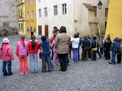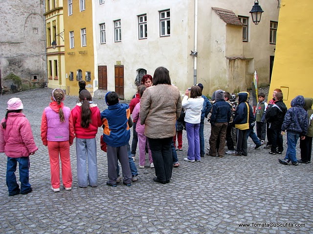 Am mai luat-o puțin la pas pe străduțele pietruite, unde ne-am întâlnit cu Ruxa, Cristina și Diana. Poze, discuții și ipoteze de genul „cum ar fi fost dacă am fi trăit într-un asemenea oraș”, după care ne-am întors la hotel să cinăm. Duminică, ziua rezervată vizitei oficiale a Sighișoarei, însoțite de un ghid, n-a fost prea prietenoasă cu noi. A venit cu un frig de ne îngheța și sufletul în noi și cu un vânt care voia parcă să ne izgonească de-acolo. Totuși am rezistat cu stoicism și am văzut Turnul cu Ceas, priveliștea Sighișoarei de la înalțime, Turnul Cositorarilor, însă doar pe dinafară, cimitirul, Biserica din Deal, celelalte turnuri ale cetății și Primăria. Mi-a plăcut tare mult de ghidul care ne-a explicat foarte multe chestii, ne-a vorbit despre sighișoreni și despre cum se ajută unii pe alții, despre regulile care stau la baza societății, despre istoria atât de frumoasă a locurilor, despre clădirile și despre monumentele care ne-au bucurat ochii. Vizita s-a încheiat cu o masă copioasă, cu o fasole în pită, pe care eu n-am putut-o savura cu ceapă roșie. 🙁 Dupa ce ne-am pus burta la cale, am luat-o din loc, mulțumind și promițând să revenim.