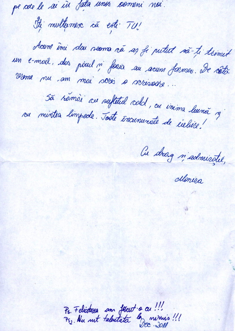 N-au fost puține dățile în care am vorbit despre câte satisfacții îmi aduce blogul ăsta. De la bani la diverse beneficii și la bucurii mai mici sau mai mari. Însă CEA MAI MARE SATISFACȚIE dintre toate rămâne ce primesc de la voi, cititorii acestui blog, al rândurilor mele zilnice, al sufletului meu pus în jurnalul ăsta virtual. V-am tot povestit despre cuvintele incredibil de frumoase pe care le-am primit de la unii dintre voi după moartea tatălui meu, despre mailurile cu sfaturi utile și cu adrese și contacte la care să apelez când am probleme, despre orice îmbrățisare primită la fiecare oftat de-al meu. Ei, Crăciunul ăsta e și mai frumos pentru că am primit scrisoarea pe care o vedeți mai jos. Monica mi-a făcut una dintre cele mai mari bucurii scriindu-mi rândurile acestea și am rugat-o să mă lase să postez scrisoarea și pe blog, să vedeți de ce îmi iubesc blogul atât de mult și cât de dragi îmi sunt cititorii mei. Și să mă laud cu ei, pentru că sunt unici.