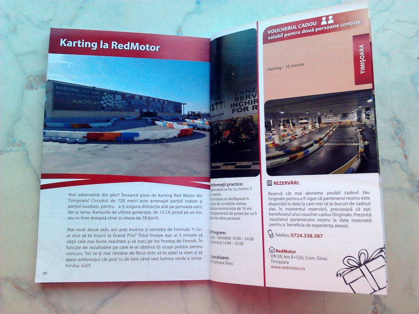 Eu am ales să merg la karting, pentru că în Timișoara sunt doar două activități pe care le poți alege: kartingul la Red Motor și escalada la One Move. Cum la escaladat am fost deja, am ales kartingul; în plus kartingul e pentru două persoane. In catalogul Sport to Enjoy mai sunt dansuri sportive, echitație, plimbare cu caiacele sau scrimă în Muntenia, Ferrari Go cart, rapel, tenis sau tir cu arcul în Transilvania, zbor cu avionul sau zbor cu parapanta în Moldova sau trekking și paintball în Crișana. Aș fi putut alege orice.