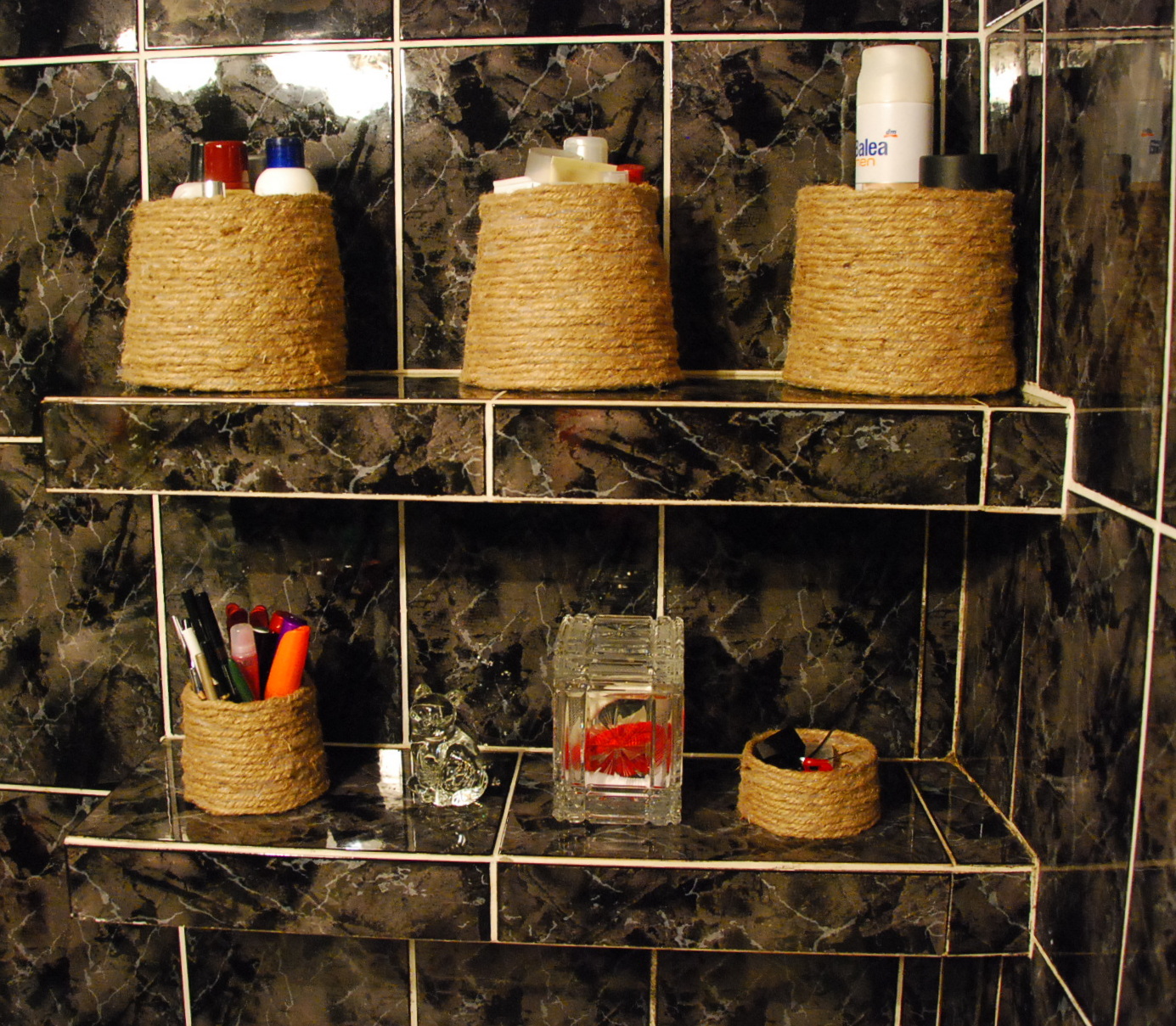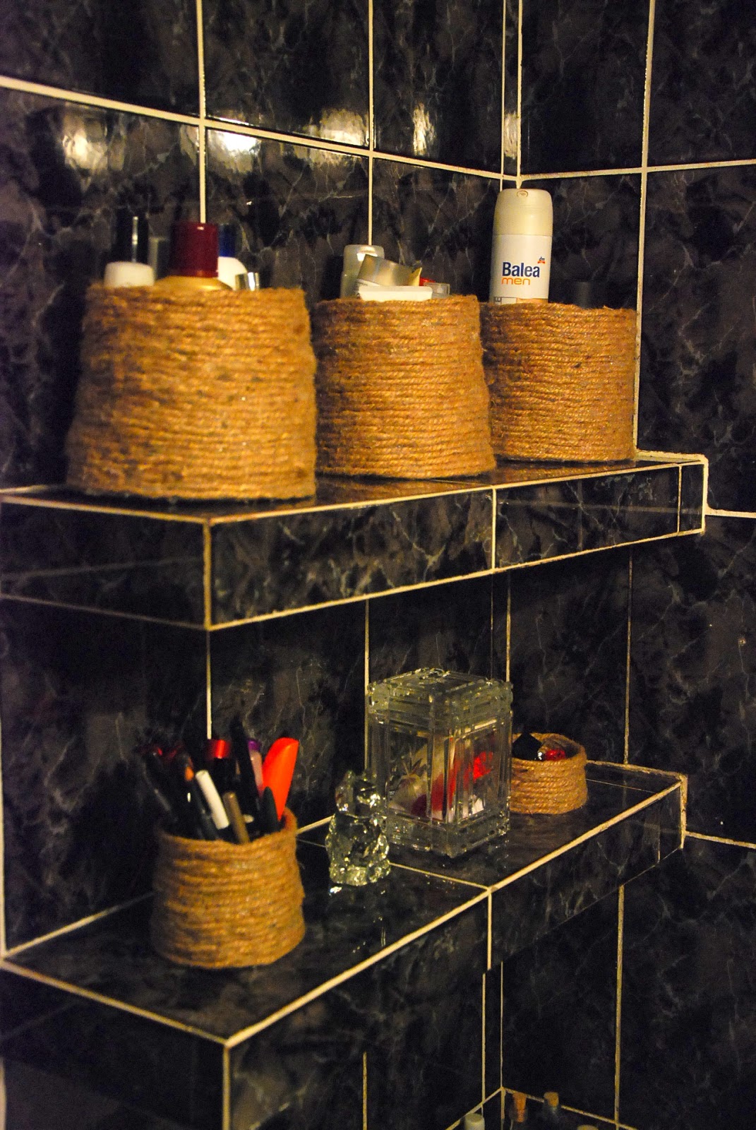 Într-o zi de vară am făcut 3 recipiente (unul mare – cel conic – deh, era prima încercare, cel pentru creioanele de ochi și cel mic pentru agrafe), într-o altă zi unul (al lui Iubi) și săptămâna asta l-am făcut și pe al treilea, pentru că deja se strânseseră prea multe creme, loțiuni și geluri care stăteau vraiște pe etajere și trebuia să le organizez cumva și să dau băii un look mai aranjat. N-am poze de before, dar așa arătă acum: