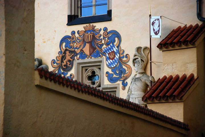 N-am intrat în Neuschwanstein, dar am intrat în Hochenschwangau, că acolo mai erau bilete. Primul castel renovat de către Maximilian I, tatăl lui Ludwig, și menit a servi drept reședință de vară. Îmi pare tare rău că nu se putea fotografia înăuntru pentru că aș fi avut ce să vă arăt. Pereții erau atât de frumos desenați, ba cu peisaje, ba cu personaje ale vremii, ba cu motive florale. Pictură direct pe perete, nu pe pânză. Am șterpelit de pe flickr-ul cuiva o mostră. Că merită să vedeți ce frumos e înăuntru.