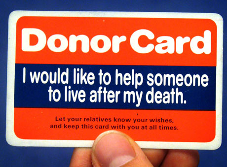 Și eu aș vrea un card din acela, să se știe că vreau să donez, că este dorința mea, că deși poate îmi exprim dorința asta în familie, familia nu va fi așa deschisă spre asta. Eu de exemplu am încercat să-i zic mamei, nu a vrut să discutăm (nu pentru că ar considera-o un păcat sau alte chestii SF ci pentru că pur și simplu nu vrea să audă că eu aș putea muri înainte ei).