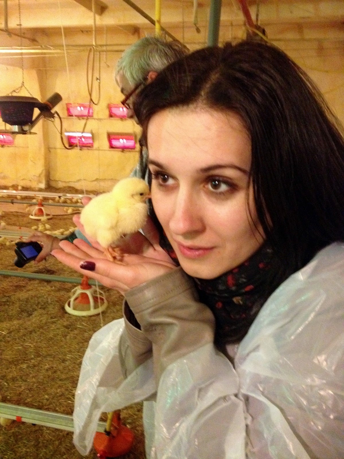 la o altă fermă, unde am luat-o cu începutul: de la cum se transformă oul în pui și apoi în găină. Ne-am echipat în halate de unică folosință – apropos, cred că au fost vreo 5 sau 6 ture de îmbăcat și dezbrăcat de halatele astea, pentru că în fiecare fermă trebuia să intrăm cu un halat nou, necontaminat.