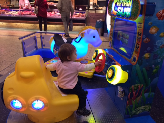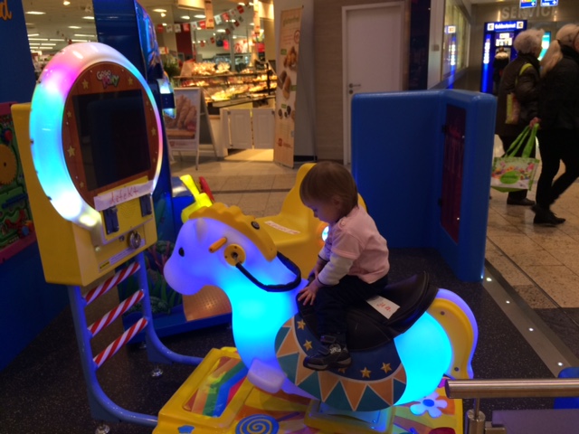 – am fost la mall să caut un cadou pentru unul dintre prietenii ei, și-am urcat-o prin toate mașinile de copii