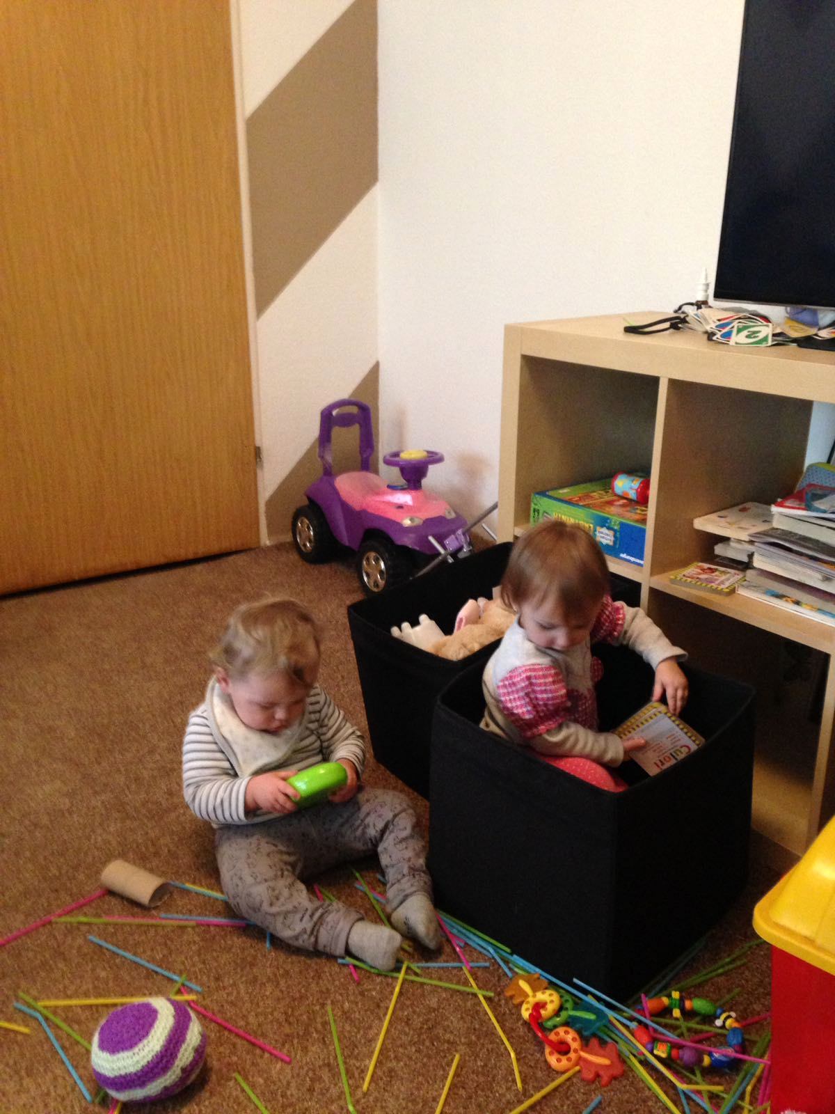– acum două zile am găzduit un playdate, la care au putut veni doar două mame cu băieții lor. A fost tare fain, am mai putut vorbi și noi una-alta, în timp ce copiii se jucau ori împreună, ori fiecare singur. Cel mai distractiv a fost partea în care Noah a plimbat-o pe Ada cu căruciorul de jucărie și Woolf a îngenuncheat în fața ei 😛