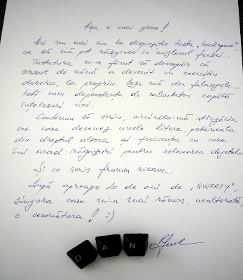 @ esk –> Mie mi se pare ca unele popoare scriu la fel. De exemplu as putea sa ghicesc imediat un neamt dupa scris. Si un francez cred. 😛 Poate asa arata scrisul romanilor.