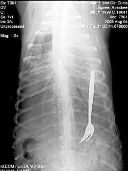 Să zicem că la animale e mai de înţeles, dar totuşi… cum să înghită un câine o furculiţă întreagă? Probabil era un câine de talie mare… că altfel…