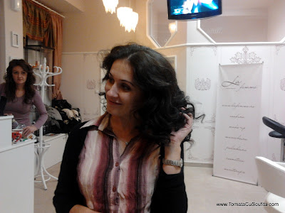 Primele au fost Cristina și Casandra care s-au tuns puțin și s-au frezat. Asta în timp ce Deme era la manichiură și Nebu la pensat. Eu v-am zis deja că mă paște o schimbare de look și am profitat puțin pentru a vorbi cu fetele despre ce aș vrea eu și ce mi s-ar potrivi. Spre nefericirea mea, toate au zis că freza pe care mi-aș dori-o nu se potrivește cu părul meu. Goddamit, că nimic nu se potrivește cu el… Da’ până în decembrie… mai am timp să caut variante. Așa că, nu m-am tuns, nu m-am vopsit (deși firele albe îmi invadează capul), ci mi-am făcut altceva ce mi-am dorit demult să văd cum îmi stă: bucle. Ocazie cu care am văzut cât de fain îți poti face părul creț cu… placa de intins. Când oi avea timp și chef, încerc și eu cu placa mea.