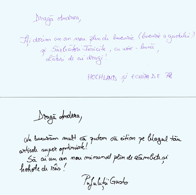 Pe de altă parte, eu am fost cam tăcută anul ăsta. Dacă de Crăciunul trecut am trimis „felicitări” cu o roșiuță din header și cu urarea “Crăciun fericit!”, anul ăsta nu am avut timpul necesar să o fac. Însă la anul îmi vor elibera programul special pentru această activitate, pentru că sentimentul pe care-l ai când deschizi cutia poștală și cad din ea plicuri, nu pliante sau facturi, e absolut magic. Vă las mai jos superbele felicitări primite anul acesta de la: