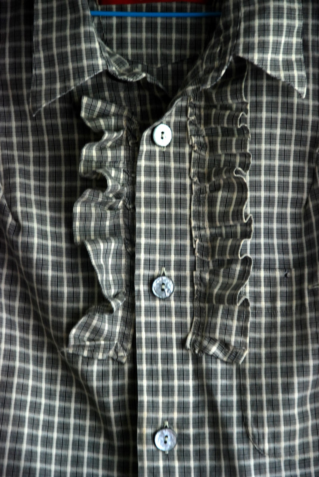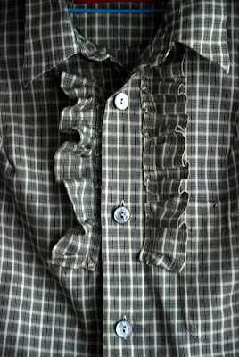 Din rezerva ce mi-a mai rămas de la mâneci, am tăiat niște fâșii pentru volanașe. Le-am tivit, le-am încrețit și le-am aplicat pe cămasă. Nu-s ele tocmai simetrice, da’ pentru o primă încercare, mă declar mulțumită.