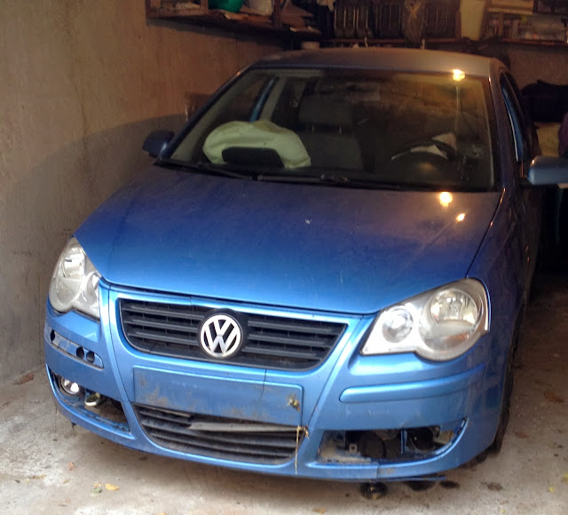 Sunt bine, am scăpat doar cu entorsa despre care vă spuneam și-acum țopai prin casă de colo colo și mă deplasez cu un cadru pentru invalizi. Ca o babă. Nu prea pot face mare lucru pentru că trebuie să îmi protejez piciorul ca să mă pot folosi de el la Londra. Am luat amendă și 4 puncte penalizare. Iar mașina arată așa. Cine știe cât mă va costa, dar merit: să-mi fie învățătură de minte, proastă ce sunt!