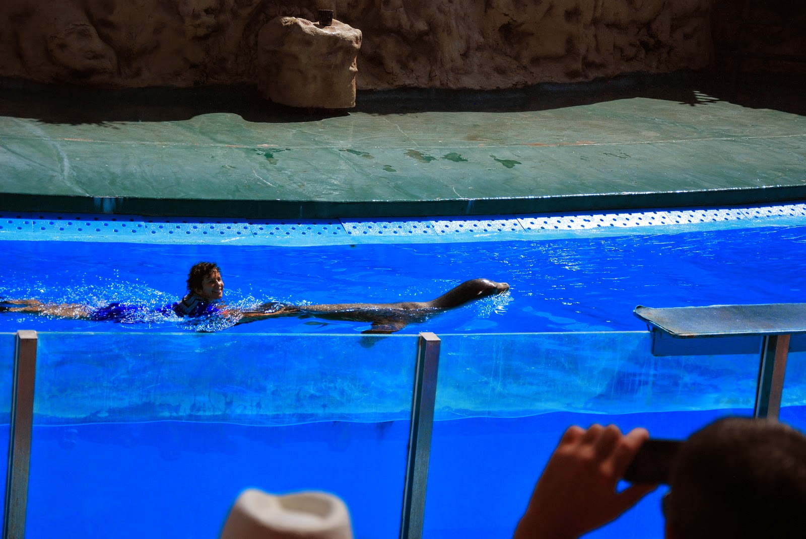 La sfârșitul acestui moment, pe un afiș scria că cine dorește poate face poze cu un leu de mare, pentru 15 euro. Eu, știind că un prieten a făcut poză cu unul, care i-a dat pusi, mi-am zis că nu pot rata un sărut de la un leu de mare. Așa că m-am pus în rând cu copiii, nerăbdătoare să mă pupe animalul. Ghici ce? Nepăsător și rece. Nici nu s-a uitat la mine, după cum vedeți. A stat neclintit, numai cu ochii după pește. Am plecat de lângă ea cu buza umflată, dar bucuroasă că măcar am atins-o. E foarte fină, dar nu mi s-a păut cu nimic mai deosebit decât un câine ud.