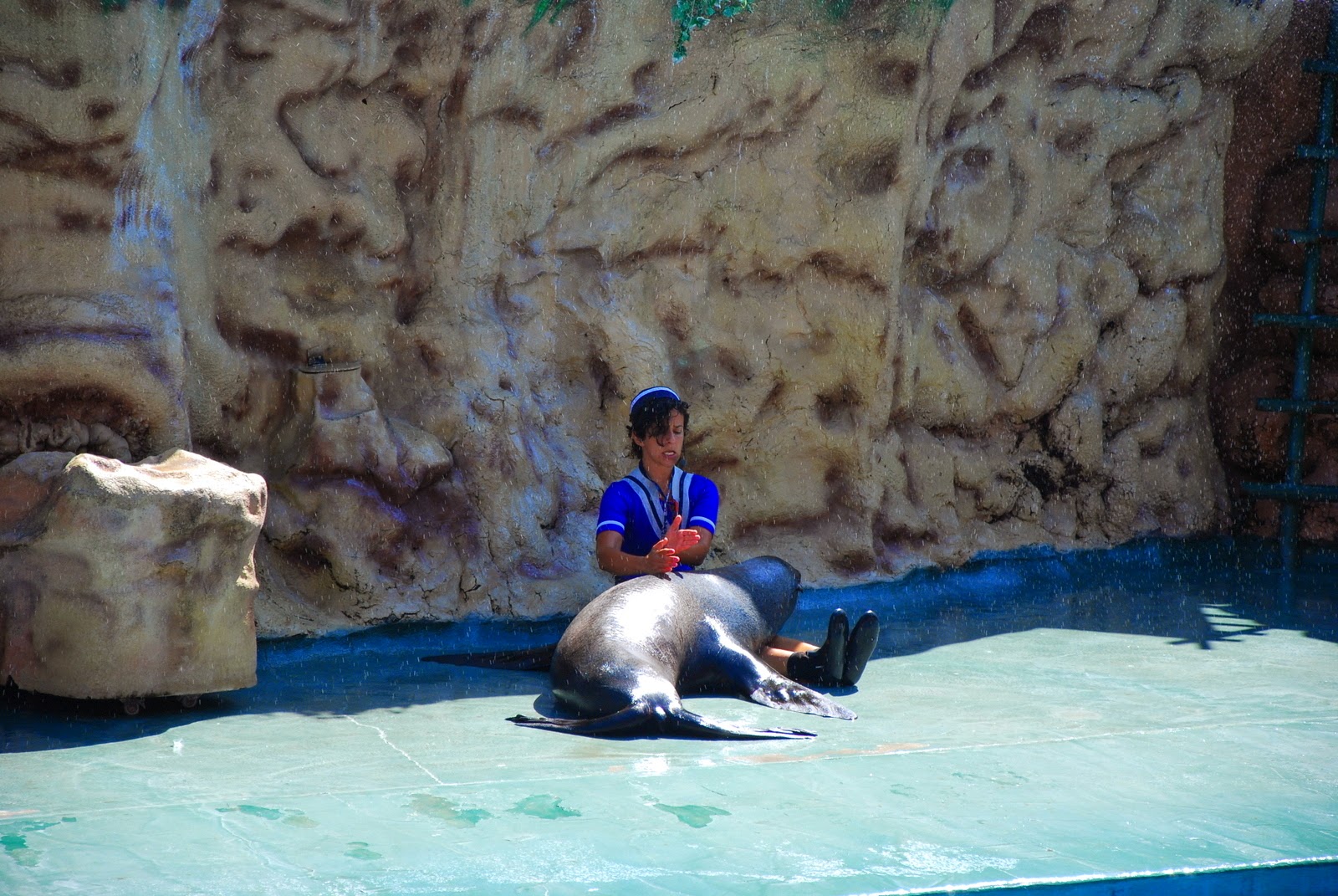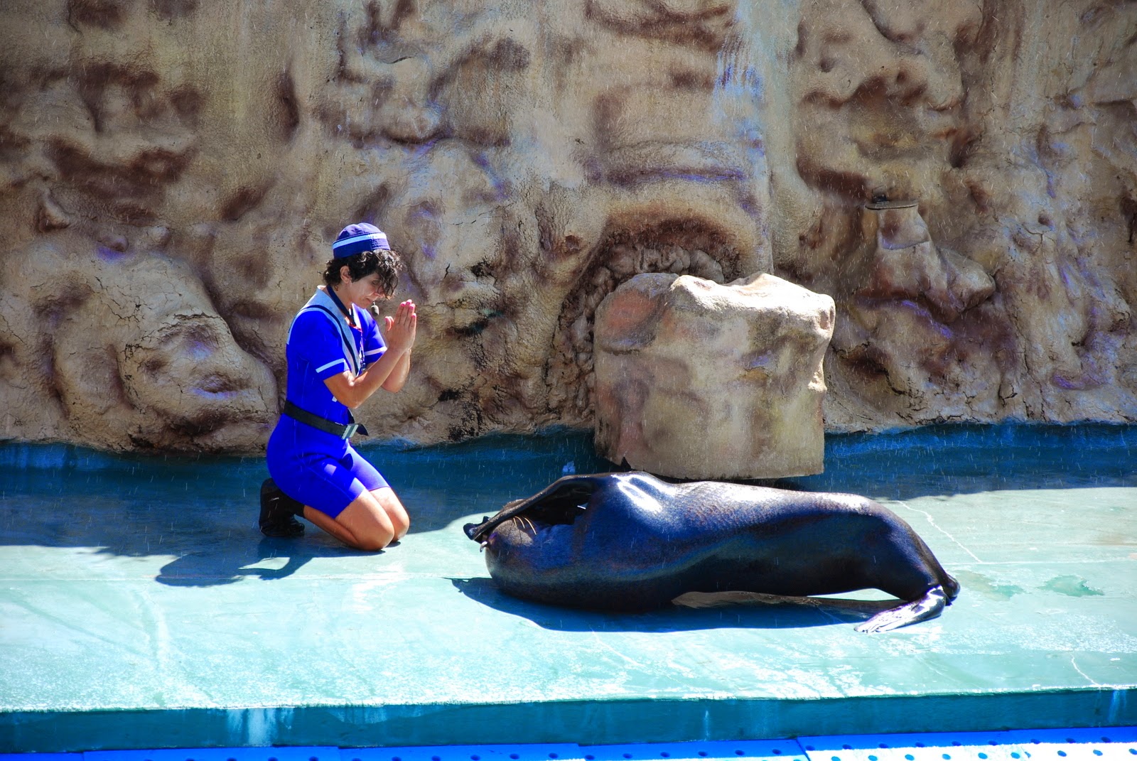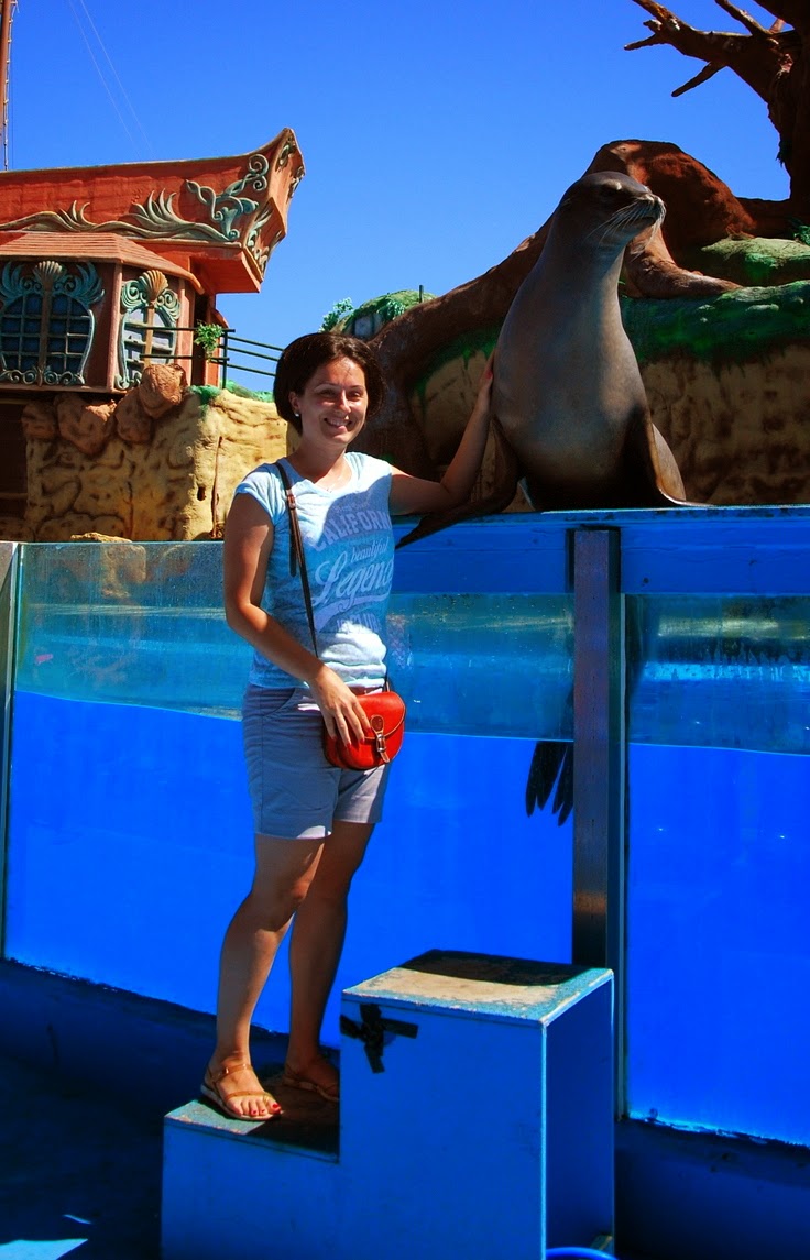 La sfârșitul acestui moment, pe un afiș scria că cine dorește poate face poze cu un leu de mare, pentru 15 euro. Eu, știind că un prieten a făcut poză cu unul, care i-a dat pusi, mi-am zis că nu pot rata un sărut de la un leu de mare. Așa că m-am pus în rând cu copiii, nerăbdătoare să mă pupe animalul. Ghici ce? Nepăsător și rece. Nici nu s-a uitat la mine, după cum vedeți. A stat neclintit, numai cu ochii după pește. Am plecat de lângă ea cu buza umflată, dar bucuroasă că măcar am atins-o. E foarte fină, dar nu mi s-a păut cu nimic mai deosebit decât un câine ud.