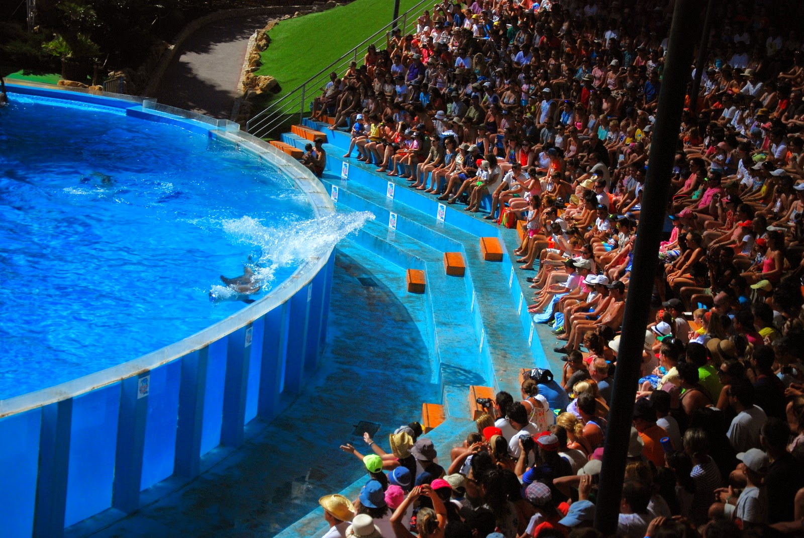 Pe lângă spectacolele cu delfini, cu care v-am înnebunit, cu foci, lei de mare, păsări exotice, păsări de pradă și acrobați, e un parc de distracții cu bazine cu valuri, cu tobogane și propulsoare de bărci pneumatice. Ajung la toate, pe rând, dar mai întâi să vă povestesc despre spectacole. La intrare am primit un pliant cu harta și cu orarul la care se pot urmări animalele în acțiune, așa că știam deja cum ne vom petrece ziua încă de la început.