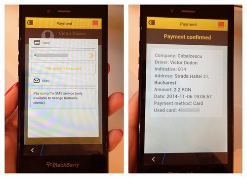 După care, dacă intenționați să platiți cu cardul, trebuie să vă introduceți datele de pe el. Plata cursei se poate face și prin SMS în rețeaua Orange, dar eu n-am tastat decât varianta plății cu cardul. Cred că-i la fel de simplu și cu SMS-ul. Găsiți opțiunea la Payment Methods. Despre plata cu cardul trebuie să vă spun că am fost puțin îngrijorată, pentru că așa ne stă nouă, românilor, în caracter. Nu de alta, dar s-au întâmplat multe. Am întrebat expres cum pot face să-mi șterg datele de pe Blackberry, să nu rămână acolo când îl trimit înapoi, și e cât se poate de simplu: dau log out din cont și se sterge orice urmă a cardului meu. De asemenea trebuie să știți că tranzacția e sigură și respectă protocoalele internaționale de plată cu cardul și este procesată de MobilPay.
