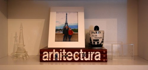 Turnul Eiffel e primit de la o prietenă, care e și o contribuitoare importantă la colecția mea de păhăruțe, „holograma” din partea dreaptă e tot cu obiective importante din Paris, iar cărțile de arhitectură sunt cumpărate de la Metro din Baia Mare cu câte 4 lei una. Cănița e adusă tot de socrii din capitala Franței.