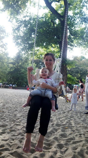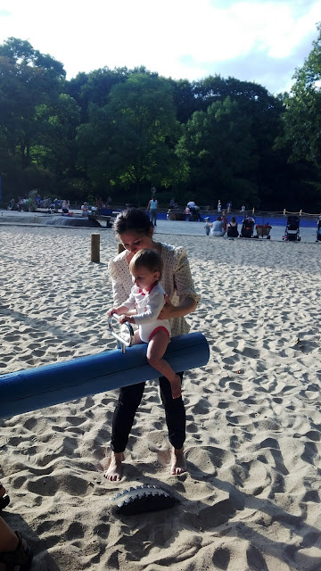 – dar cea mai faină parte a fost la locul de joacă pentru copii, unde s-a jucat cu apa, am dat-o pe tobogan, pe huța (împreună cu mine), a sarit un pic pe ceva ce semăna cu o trambulină, s-a jucat în nisip, s-a cățărat pe niște sfori. Da, distracție mare.