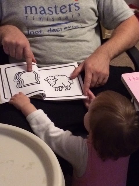 – din ce în ce mai interesată de cărți. Vine cu ele la noi să ne arate sau sa îi arătăm noi ei. Are una care scoate sunete și e foarte fascinată de ea, însă nu poate apăsa singură că e nevoie de puțină forța.