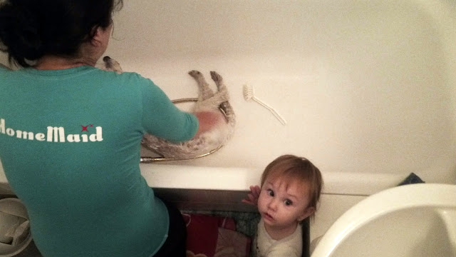 – Ada e foarte, foarte bună prietenă cu Ricky, ceea ce nu mă bucură mereu. Nu mai mănâncă nimic fără să-i dea și lui, iar el nu-i prost și o urmărește peste tot, poate-poate pică ceva. Uneori trebuie să-i despart pentru că nu îi pot da biscuiți sau fructe pentru că vrea să împartă cu el. Și când se prinde că Ricky e în spatele ușii închise, îl aude că plânge și începe și ea. Ca la nebuni. Iubire prin ușă. În poza de mai jos e prima baie a lui Ricky la care asistă Ada și nu știe ce-i fac și cu ce a greșit câinele de îi fac asta.