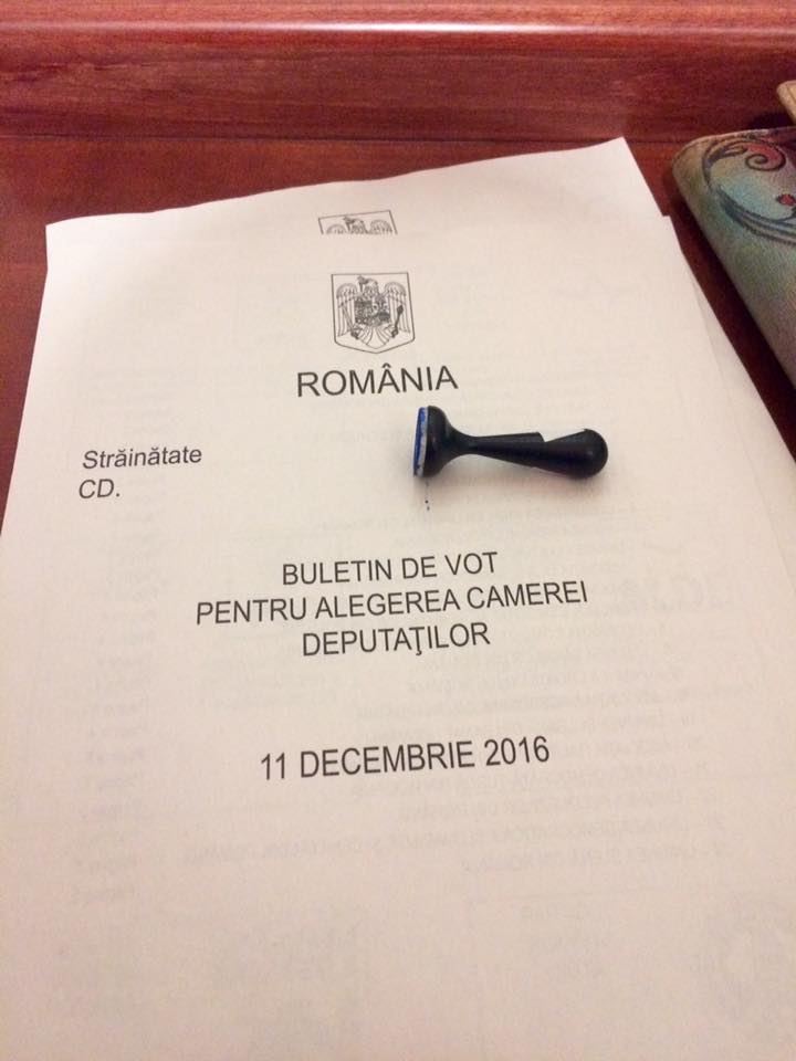 Într-un final primesc ce-mi trebuie, intru și încep să pun întrebări stupide ca și când n-aș mai fi votat în viața mea. „Stați așa, să vă scanez buletinul și vă spun imediat ce trebuie să faceți.” Era o masă de vreo 10-12 persoane și vreo 3 mă chemau la ei să-mi de carnetele de vot. Mă uitam pierdută la toți și nu știam de cine să ascult. Toți zâmbitori, binevoitori, odihniți… eu mă gândeam că am adormit și că sunt într-un vis frumos. Intru în cabină, frunzăresc carnetele, deși știam cu cine votez, pun ștampila, fac poza de mai jos și ies cu ele îndoite să le depun în urne. Mi-am primit buletinul, la revedere, la revedere, a durat două minute și, ieșind din ambasadă, mă simțeam într-o duminică după ce mi-am făcut temele pe toată săptămâna, am învățat toate lecțiile și abia aștept să mă duc la școală. Știți sentimentul, nu?