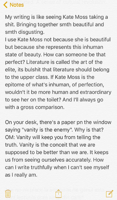O să pun mai jos un print screen cu ce am mai auzit în această discuție, pentru că ar fi prea mult să mai parafrazez și deja am scris 4 pagini de Word. Detalii despre scriitură și despre literatură, așa cum o percepe Ottessa Moshfegh.