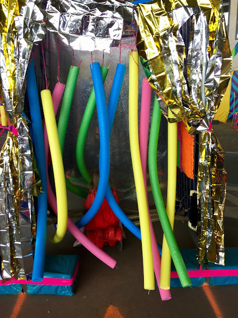 cu spalatorie si uscatorie construite din tot felul de bureti, tevi, baloane, covorase pentru yoga,