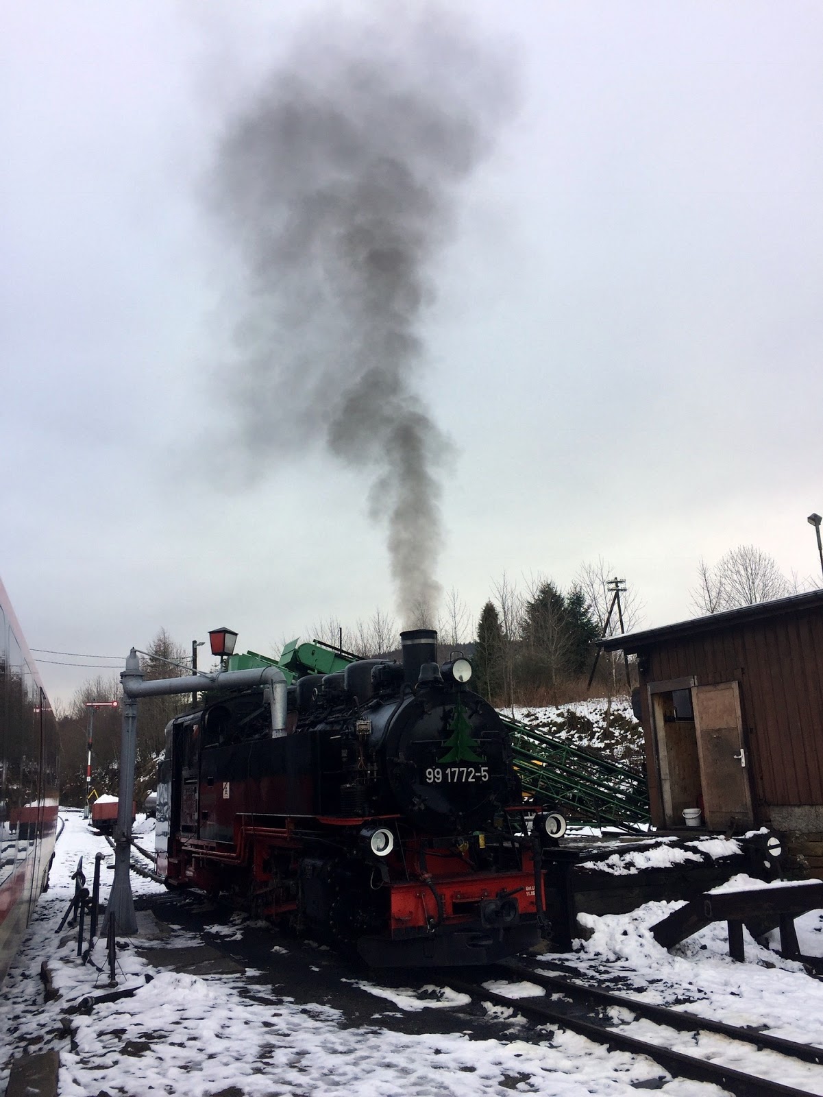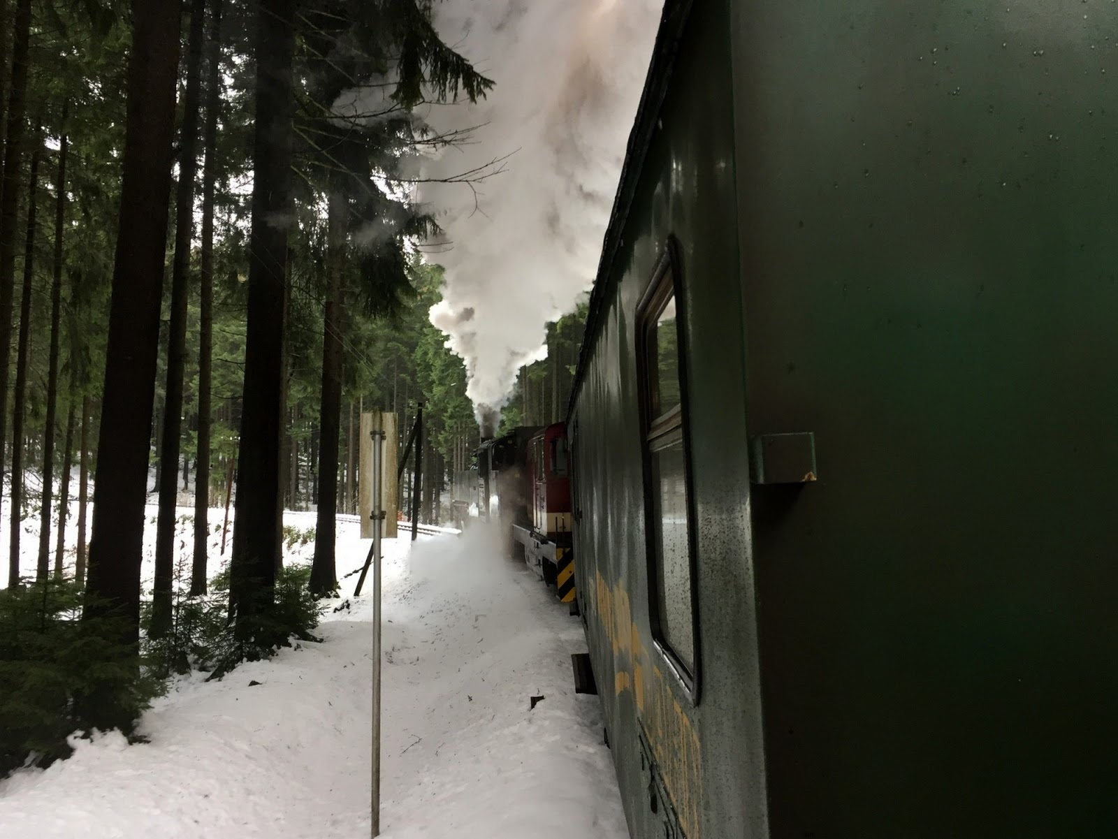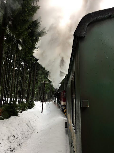Am lasat povestea noastra de Craciun in ultima ei zi, adica 26 decembrie. Insa cea mai buna parte a acestei povesti s-a intamplat ieri, pe 27. A fost, pentru mine, o farama de fericire, ca doar stiti ca fericirea e facuta din momente scurte, iar eu l-am savurat pe asta din tot sufletul. Pe drum catre Karlovy Vary am vazut din masina un tren cu aburi. Peisajul era exact ca in povesti: munte, zapada, locomotiva ce lasa un nor stufos in urma ei. N-am apucat sa fac poza pentru ca eram in miscare, trenul trecuse. Insa mi-am notat numele satului in care eram si dupa cativa kilometri am vazut gara trenului cu aburi si repede mi-am notat-o si pe aia. Sa caut informatii, nu m-as fi gandit ca peste 5 zile, urma sa fim si noi pe șine. Am uitat de el pana intr-o zi cand am zis, ia hai sa investighez un pic si daca tot suntem aici, foarte aproape de experienta asta, in cadrul asta de poveste, de ce sa nu calatorim cu el acuma, ca cine stie daca mai ajungem pe aici si cu siguranta nu ne vom intoarce in zona doar pentru asta. Fericirea incepea sa se instaleze pe masura ce descopeream tot mai multe detalii: ruta, orar, preturi. Daca va intereseaza si ajungeti vreodata in zona, acesta e site-ul.