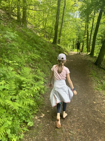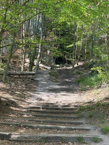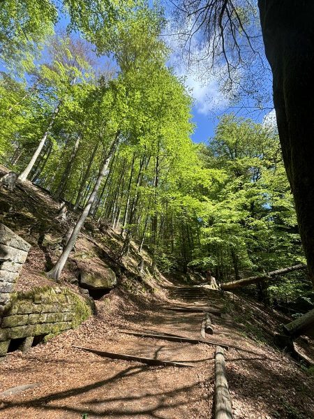 Doar că după ce am urcat pe scări, în timp ce admiram Burg Wildenstein, cugetam eu că e totuși prea devreme să ne retragem în oraș și că mai sunt chestii interesante de văzut pe munte. Și îmi conving echipa să mergem la Wilde Hölle. Știți ce înseamnă? Iadul sălbatic. Well, prieteni, fix aia a fost, însă până să ajungem acolo a trebuit să convingem copilul, deja obosit, mârâit, mai cu vorba bună, mai cu aia mai stridentă, că oricum nu știam ce ne așteaptă acolo. Și când am dat de indicatorul care ne anunță mare și lat că e GREU, noi tot am dat înainte, temerari. OK fie, un traseu mai accidentat cu mulți bolovani și rădăcini, dar ce mare brânză?, mâncam de astea pe pâine în tabere prin copilărie. Și ajungem la poarta iadului, unde intrăm printr-o falie că a trebuit să îmi ridic genunchiul până la urechi să pot trece mai departe. Au urmat scări abrupte, pasaje cu mânere și scări pe stancă, încurajări de la străini sau pentru străini din partea noastră… ce mai, highlight-ul călătoriei. Ada înviase și era ca o căpriță de munte, nimic nu părea să îi fie greu. Na, nici mie nu mi-a fost extrem de greu, dar surpriza m-a luat pe nepregătite și precauția, plus grija pentru căpriță mi-a cam pus simțurile în alertă. Și toată durerea și înțepăturile din picioare s-au dispersat pentru că deja tot corpul era pus în mișcare.