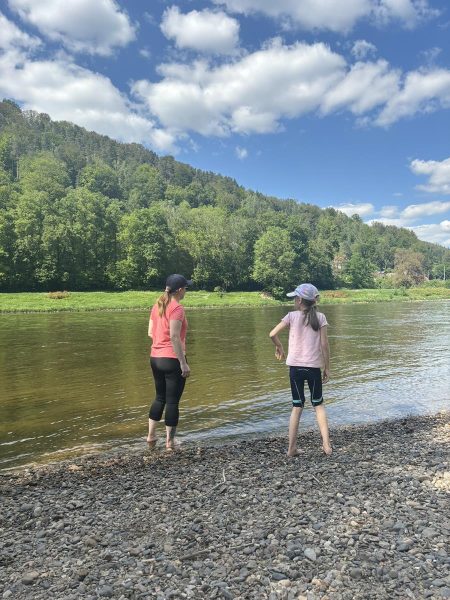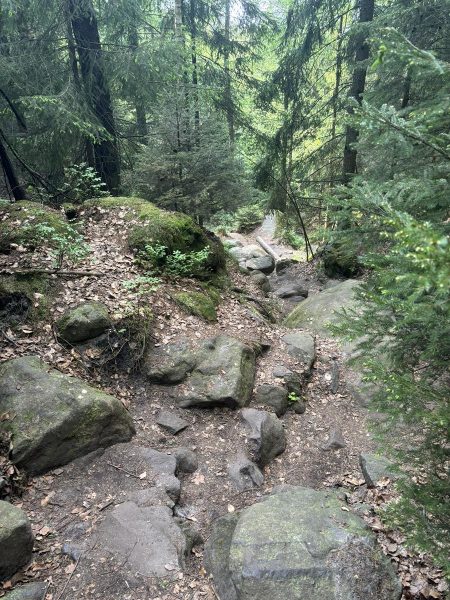 Când am terminat cu podul, am luat-o pe traseul care ducea la râu. Multe, foooarte multe scări de coborât, (zicea Sotzu’: “Și când te gândești că toate scările astea le vom urca la întoarcere!”) și am ajuns în Rathen unde am mâncat ceva, am băut o cafea și am pornit mai departe, pe un traseu mai gingaș cu picioarele. Înainte de a intra în pădure am întâlnit o pisică tare jucăușă, după care ne-am continuat drumul pe potecă, am dat de case în inima pădurii și am ajuns la Elba, unde nu ne-am abținut să ne descălțam și să ne bagăm picioarele în apă, cum facem mai mereu când dam de apă și e destul de cald să ne umezim degetele.