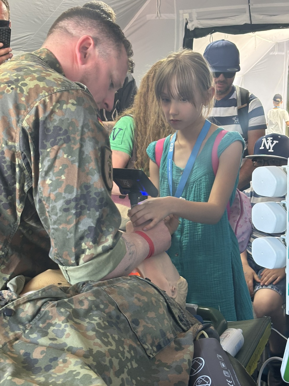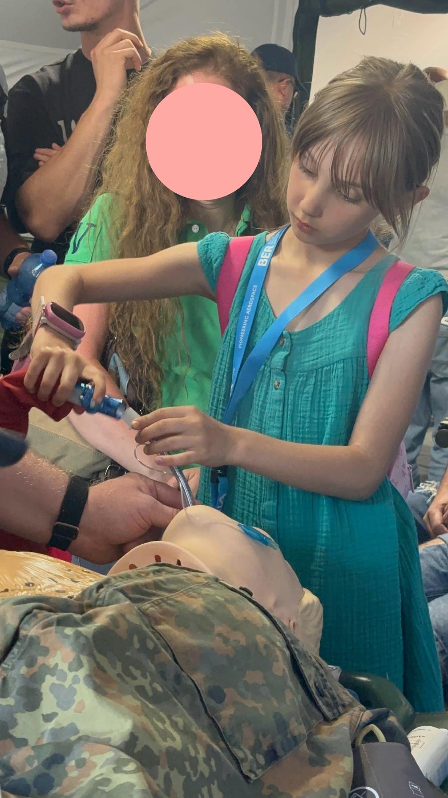 Cea mai tare chestie mi s-a părut o activitate dedicată copiilor, ușor neobișnuită, aș spune eu, dar mega interesantă. Plimbându-ne de la avioane la avioane, am ajuns la un cort de armată unde nu era mare coada. Am intrat să vedem ce-i acolo și am dat peste o fetiță îndrumată de un doctor militar care intuba un manechin “rănit” întins pe o targă. Hopa! E cu doctori, I’m in. Ada s-a dus să vadă ce se întâmplă de cum a intrat în cort. Avea ochii cât cepele de curiozitate și eram sigură că vrea și ea să încerce. Și sincer, îmi doream în secret să vrea să încerce, pentru că mi se părea AȘA cool să poți face la 8 ani o intubare!!! În situații de genul, nu o presez și nici macar nu îi spun ‘du-te și fă și tu’, dar o întreb dacă ar vrea. În 90% din cazuri răspunsul e DA. La fetița care era în acțiune, manechinul a și ‘respirat’, însă la următorul copil și la Ada n-a mai respirat, că doctorul nu pusese bine perna de aer. Însă amândoi făcuseră procedura ca la carte.