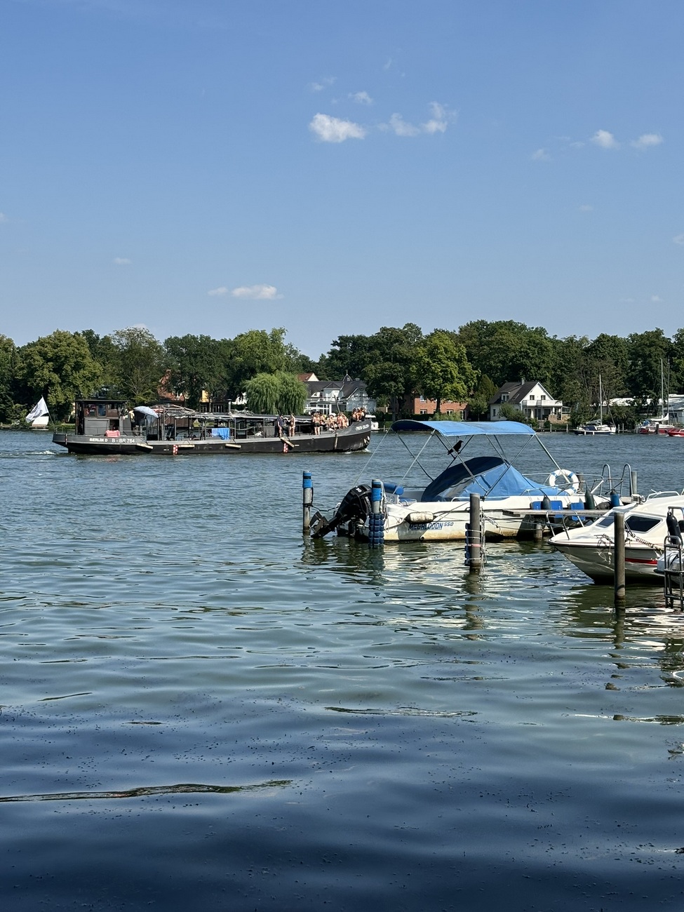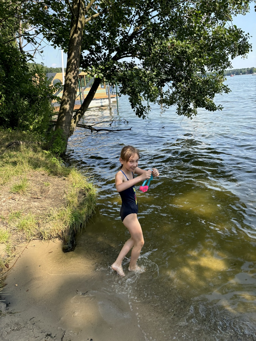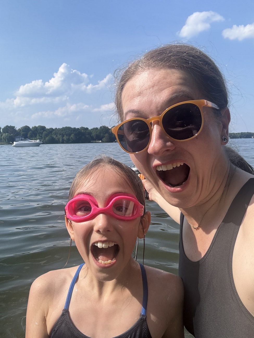 N-a durat mult, am ieșit, am dat o raită prin Flohmarkt-ul de la ieșire și ne-am îndreptat către casă. Ada insista pe drum să mergem undeva la piscină. Nimeni nu mai avea nici un chef, deși eram toți transpirați și ne-ar fi prins bine o bălăceală. Până să ajungem acasă, am cedat eu și am zis că o duc la lac să se bălăcească. Nu de alta, dar nu știm când mai prindem așa căldură. Ne-am pregătit, am lăsat Sotzu’ acasă să se ocupe de cină și ne-am dus la lacul de lângă noi, unde e o plajă amenajată. Plin de mașini și nici înăuntru nu se putea intra pentru că era plin. E un spațiu privat, amenajat, cu plajă proprie și se plătește intrare. Nu-i nimic, îi spun, e o plajă și pe malul celalalalt. Zis și făcut. Parcăm mașina în stația feribotului, ne urcăm și căutam pe Maps cum să ajungem până acolo. 15 minute de mers pe jos. Ne-am oprit însă chiar înainte să ajungem acolo că am dat de un mal unde se scăldau mai mulți copii și părinți și ne-am întins acolo prosoapele. Apa, desi la început părea rece, era, de fapt divină odată ce te obișnuiai cu ea. Ne-am bălăcit cam jumătate de oră, Adei au început să îi clănțăne dinții, așa că am ieșit, ne-am îmbrăcat și am plecat satisfăcute către casă. Unde Sotzu’ era în toiul gătitului. Numai bine am avut timp să facem baie și să coborâm la cină.