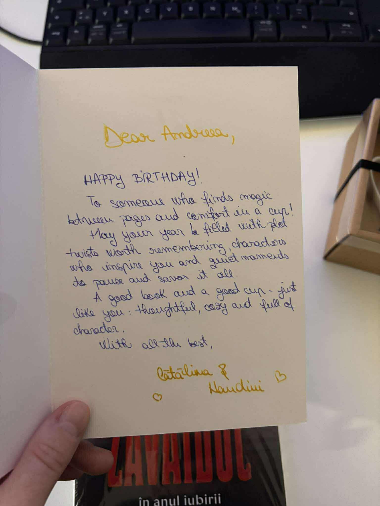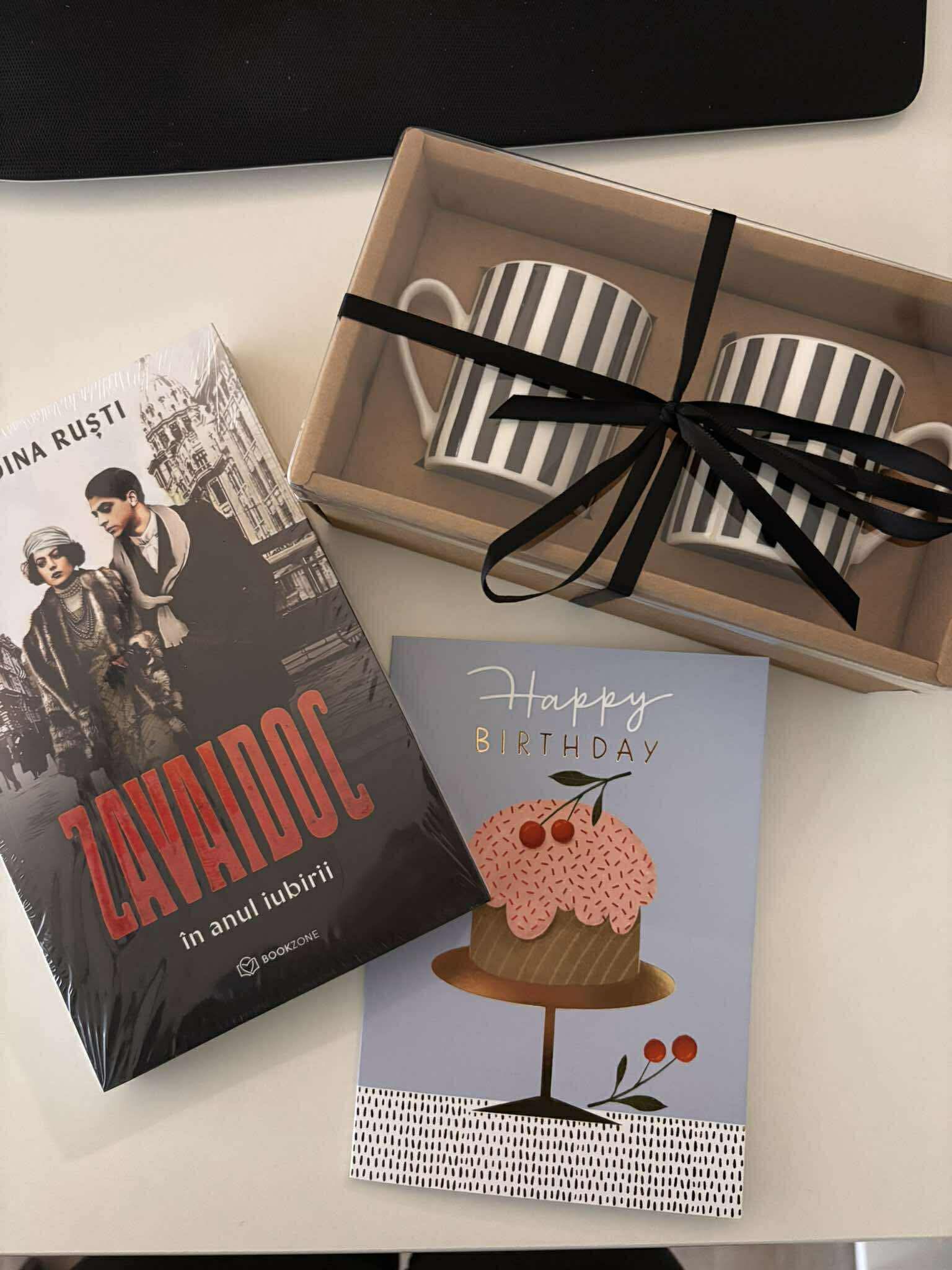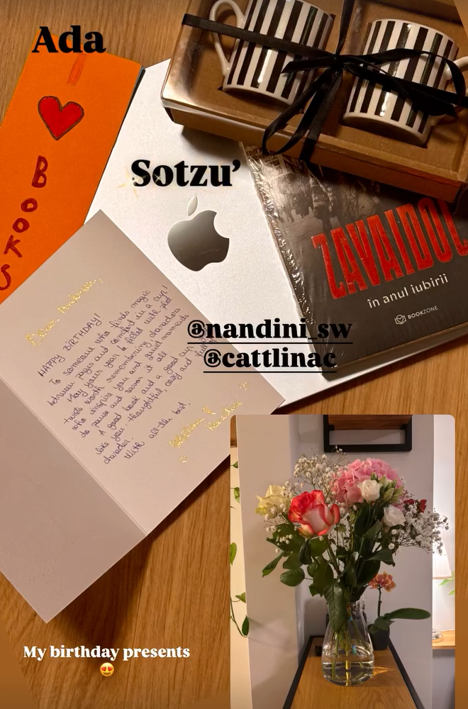 Pe 9 a fost ziua mea și din nou nu am făcut nimic pentru că nu mai am energie și nici chef să mă dau peste cap să mă sărbătoresc. Am luat prăjituri scumpe și frumoase, deci puțin tot am sărbătorit. Sunt recunoscătoare că am mai trăit un an, însă în timpul săptămânii, cu o stare de sănătate foarte enervantă, numai de party și oameni nu aveam chef. Sotzu’ m-a surprins din nou cu un cadou pe care nu doar că nu îi spusesem vreodată că îl vreau, dar nu era nici necesar, însă am învățat să mă las răsfățată și am acceptat cu bucurie MacBook Air-ul pe care mi l-a împachetat în hârtie de Crăciun :)) Din seria cadourilor, am mai primit un semn de carte făcut de Ada, flori de la ea și tatăl ei, două ceșcuțe de espresso, o carte și o felicitare de la două colege de la birou și un voucher la Dussmann de la o prietena româncă 🙂 M-am bucurat de toate.