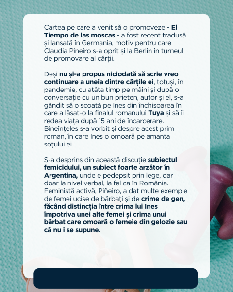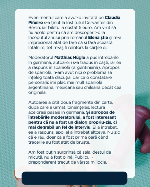 Pe 7 ianuarie am participat la un eveniment care o avea pe Claudia Pineiro invitată și cu ocazia asta am fost prima oară la Institutul Cervantes din Berlin. Despre eveniment am scris pe Instagram, așa că las mai jos ce am postat. Mi-a plăcut foarte mult și după ce am citit Elena știe, am știut că voi mai citi și altceva de la ea.
